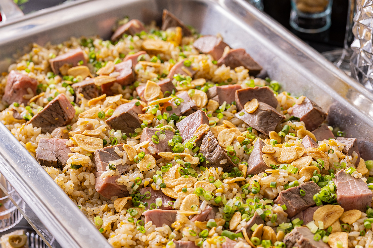 ほかほかに温めたガーリックステーキピラフは、チューフィングで常に食べごろの状態をキープ。