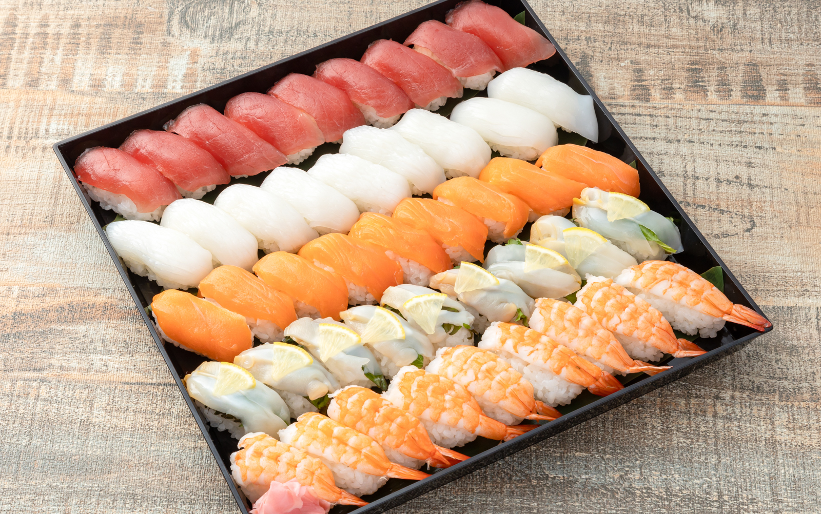 江戸前寿司粋一貫監修のマグロ、イカ、サーモンなど大定番の本格握り寿司。