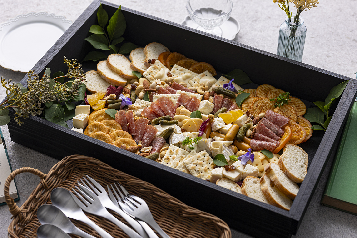 チーズ3種類のほかにサラミ、ドライフルーツ、ナッツ類、クラッカーも入れたサイドメニューにぴったりのお料理です。パーティーのテーブルを彩る美しいアクセントになり、ゲストを驚かせる一品になるでしょう。会場が盛り上がること間違いなしです。