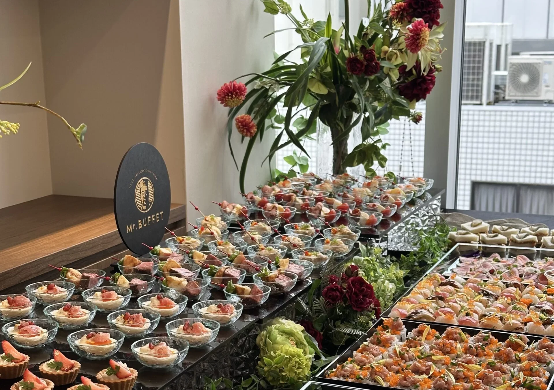 彩り豊かな料理を美しく盛り付け、会場の雰囲気に合わせたレイアウトで視覚的にも楽しめる空間を演出。